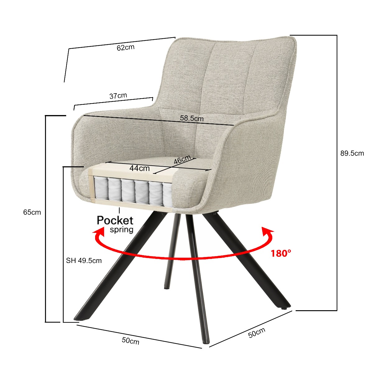 De Tori eetkamerstoel brengt modern design en zitcomfort mooi samen. De zachte bekleding en de gevormde rugleuning geven de stoel een warme en uitnodigende uitstraling. De zitting met pocket springs zorgt voor een heerlijk comfortabele en ondersteunende zit, perfect voor lange diners. Dankzij het 180° draaibare onderstel geniet je van extra flexibiliteit en gemak. Met de Tori draaistoel haal je niet alleen een praktisch meubelstuk in huis, maar ook een subtiele blikvanger die elke ruimte een verfijnde uitstraling geeft. Ontdek de perfecte combinatie van design en comfort!