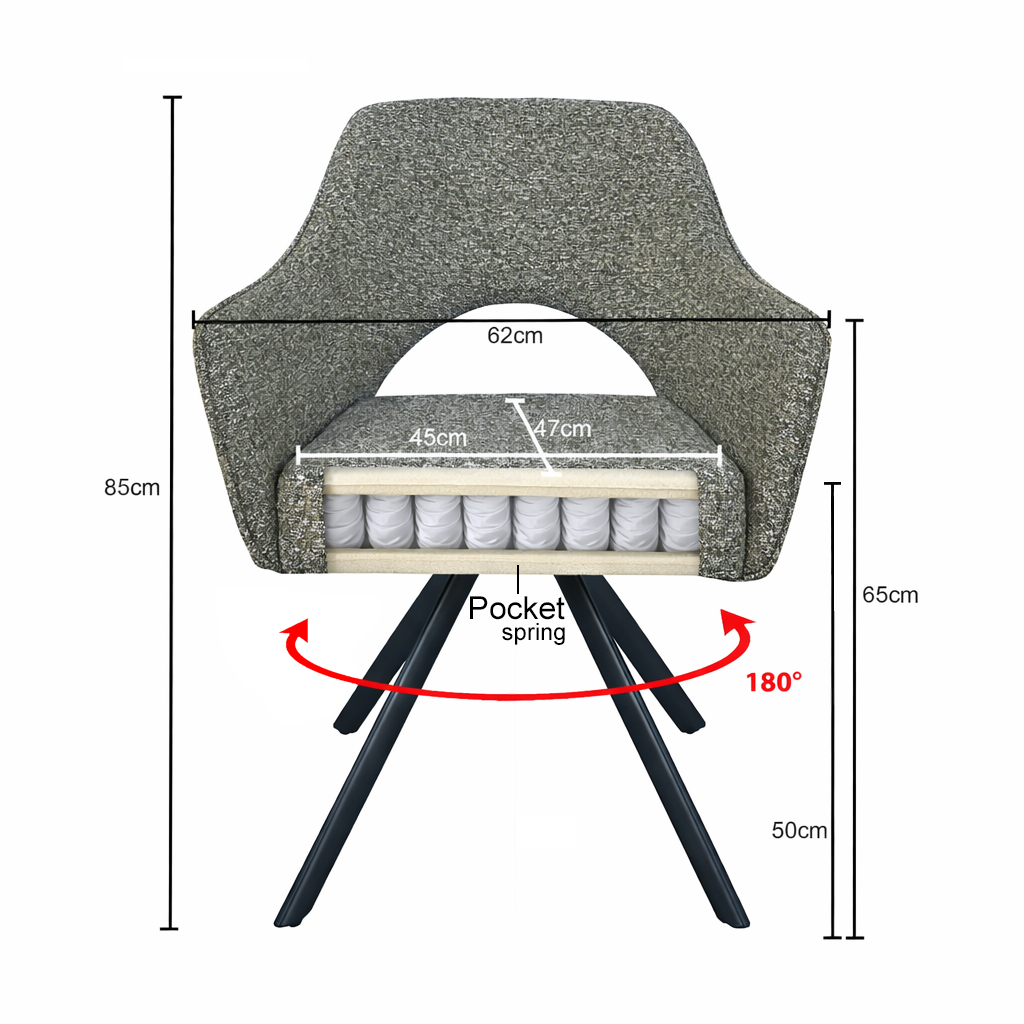 De Helen eetkamerstoel combineert comfort en verfijnde vormgeving in een eigentijds ontwerp. De elegante lijnen, zachte bekleding en geïntegreerde armleuningen geven de stoel een rustige en uitnodigende uitstraling. De zitting met pocket springs zorgt voor uitzonderlijk zitcomfort en optimale ondersteuning, ideaal voor lange en ontspannen momenten aan tafel. Dankzij het strakke 180° draaibare onderstel ervaar je extra gebruiksgemak en bewegingsvrijheid in het dagelijks gebruik. Zo is de Helen niet alleen bijzonder comfortabel, maar ook een stijlvolle toevoeging aan iedere eetkamer.