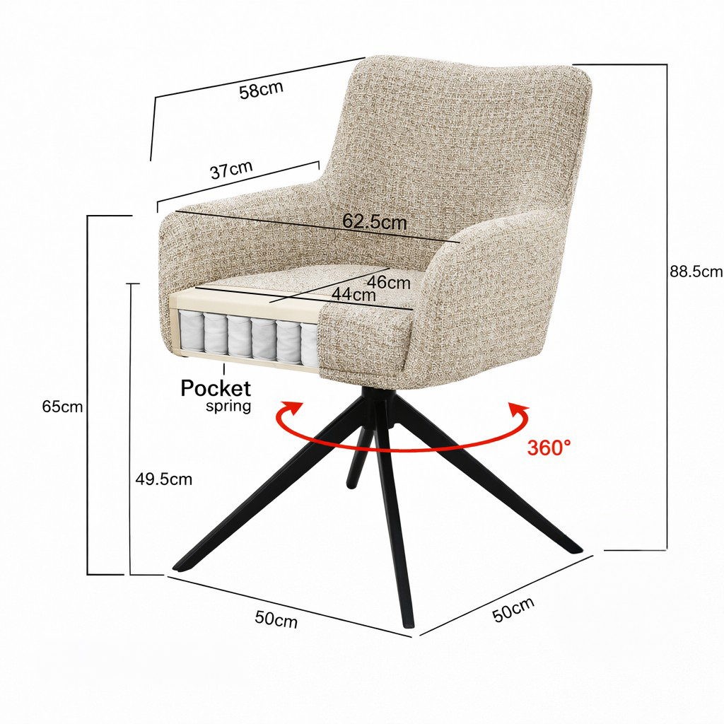 De Tara eetkamerstoel brengt comfort en stijl samen in een eigentijds ontwerp. De hoge rugleuning en het comfortabele zitkussen met pocket springs zorgen voor een heerlijk ontspannen en goed ondersteunende zit. Het slanke, moderne, 360° draaibare onderstel met automatische terugdraai functie maakt plaatsnemen en opstaan extra gemakkelijk en zorgt ervoor dat de stoel altijd netjes terugkeert naar zijn oorspronkelijke positie. Zo is de Tara niet alleen bijzonder comfortabel, maar ook een stijlvolle toevoeging aan iedere eetkamer.
