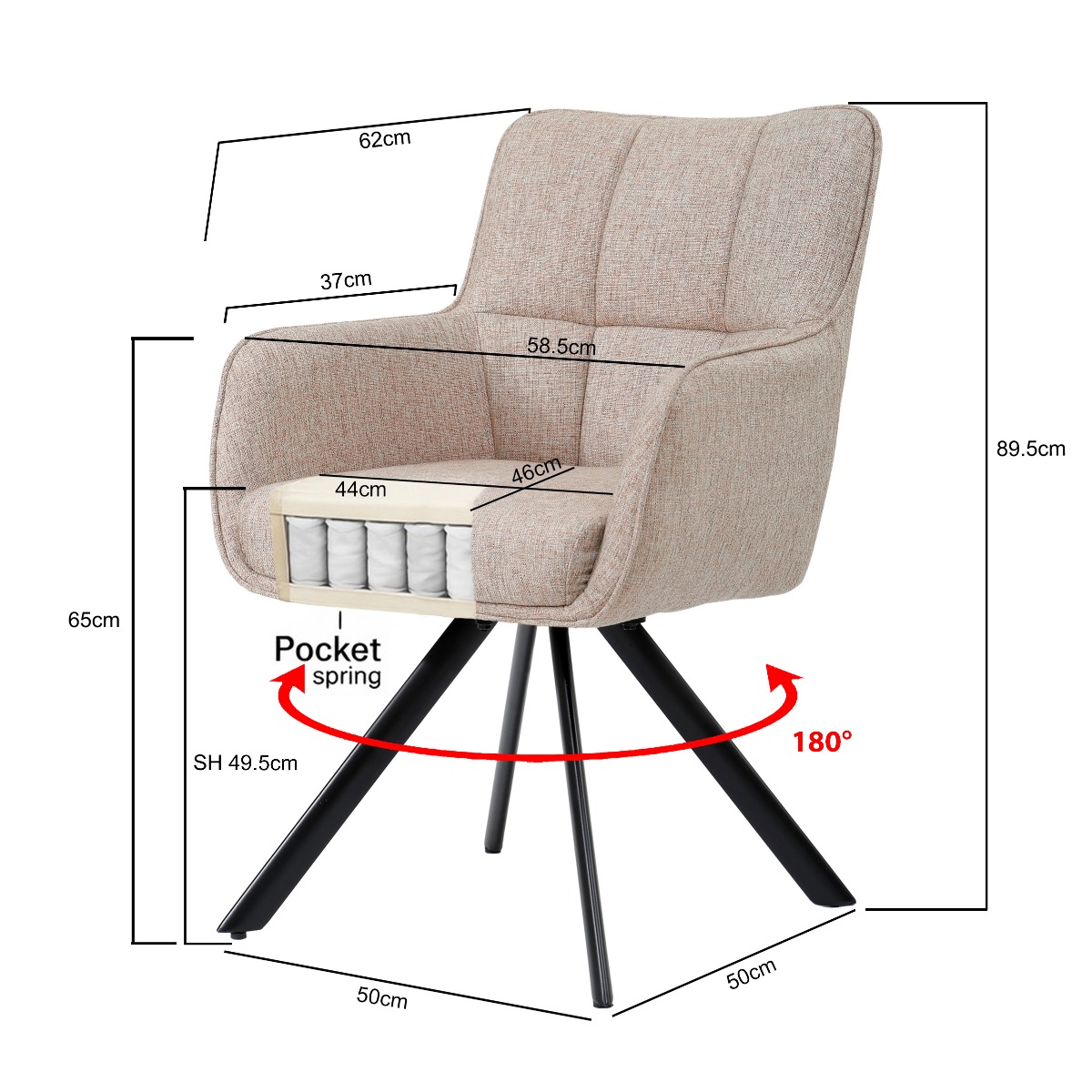 De Tori eetkamerstoel brengt modern design en zitcomfort mooi samen. De zachte bekleding en de gevormde rugleuning geven de stoel een warme en uitnodigende uitstraling. De zitting met pocket springs zorgt voor een heerlijk comfortabele en ondersteunende zit, perfect voor lange diners. Dankzij het 180° draaibare onderstel geniet je van extra flexibiliteit en gemak. Met de Tori draaistoel haal je niet alleen een praktisch meubelstuk in huis, maar ook een subtiele blikvanger die elke ruimte een verfijnde uitstraling geeft. Ontdek de perfecte combinatie van design en comfort!